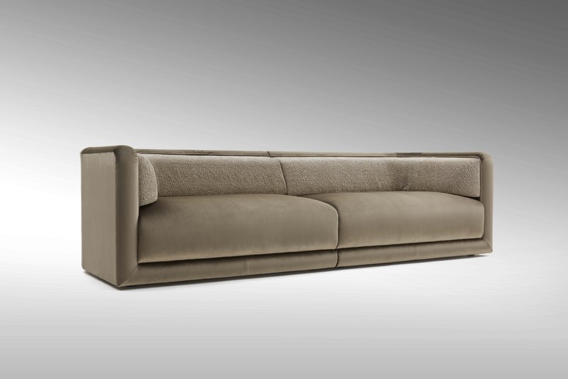 Fendi Casa Conrad sofa features elegant yet geometric lines in the sign of the highest refinement. The seatback, with a lowered profile in line with the sofa arms, embraces big cushions in a play of smoothness and volumes. In line with the Collection aesthetics, the upholstery celebrates creativity and material combination by blending the structure and the seat in velvet with the back in an elegant astrakhan pattern fabric.