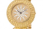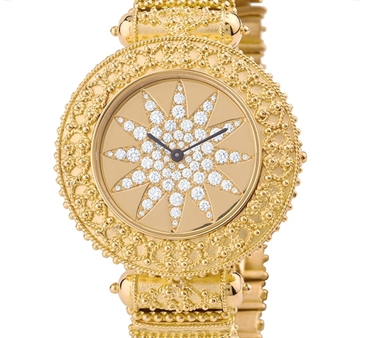 Matthia’s & Claire presents Etrusca and once again displays its watchmaking and jewellery-making talent. The gemset yellow gold model enriching the existing jewellery collection refers to an historical period known for its magnificent goldsmithing: the Etruscan civilisation of which the Ticino-based brand reproduces the distinctive granulation technique. This consists of adorning the surface to be decorated with thousands of tiny gold granules and of fixing them to the piece of jewellery by soldering, yet without modifying their finesse. The bezel and bracelet links display this 7th century B.C. expertise now interpreted in a timepiece.