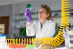 Professor Donald in the laboratory looking at an image of a fluorescently stained mammalian cell (fibroblast). In the background, the computer screen shows an image of such cells spreading on a patterned surface, work directed towards understanding how to control cell spreading.