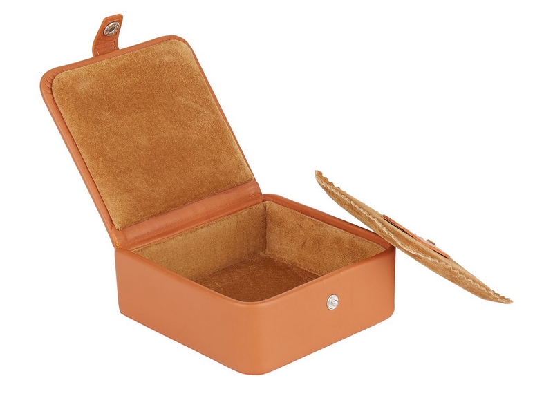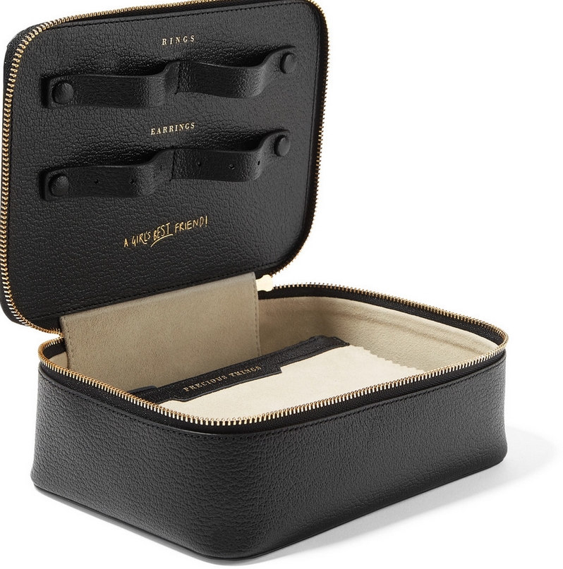 This Anya Hindmarch travel case doubles as a jewelry box. The textured-leather jewelry case fitted with a host of softcompartments to stow earrings, ring and necklaces. The zipped pockets are perfect for storing keepsakes and small items.