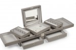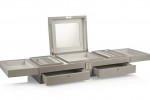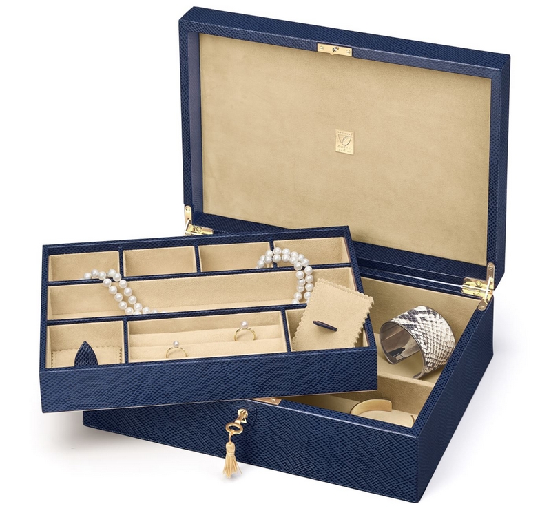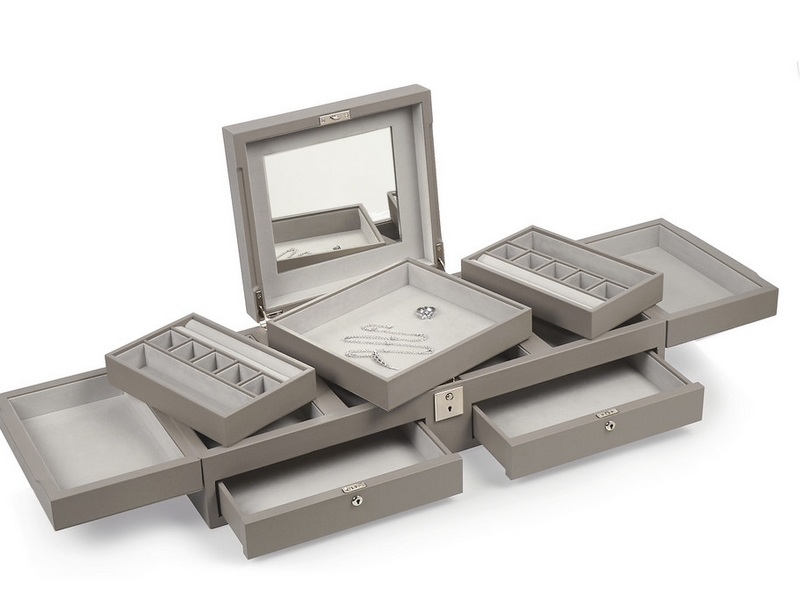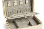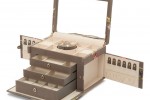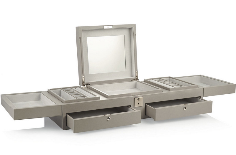 Crafted in Spain from dove-gray leather, this organizer from Smythson boasts ample space with pull out drawers, hinged compartments and rows of ring cushions. It’s lined in soft tarnish-resistant suede, finished with a built-in mirror and secures with subtle locks.