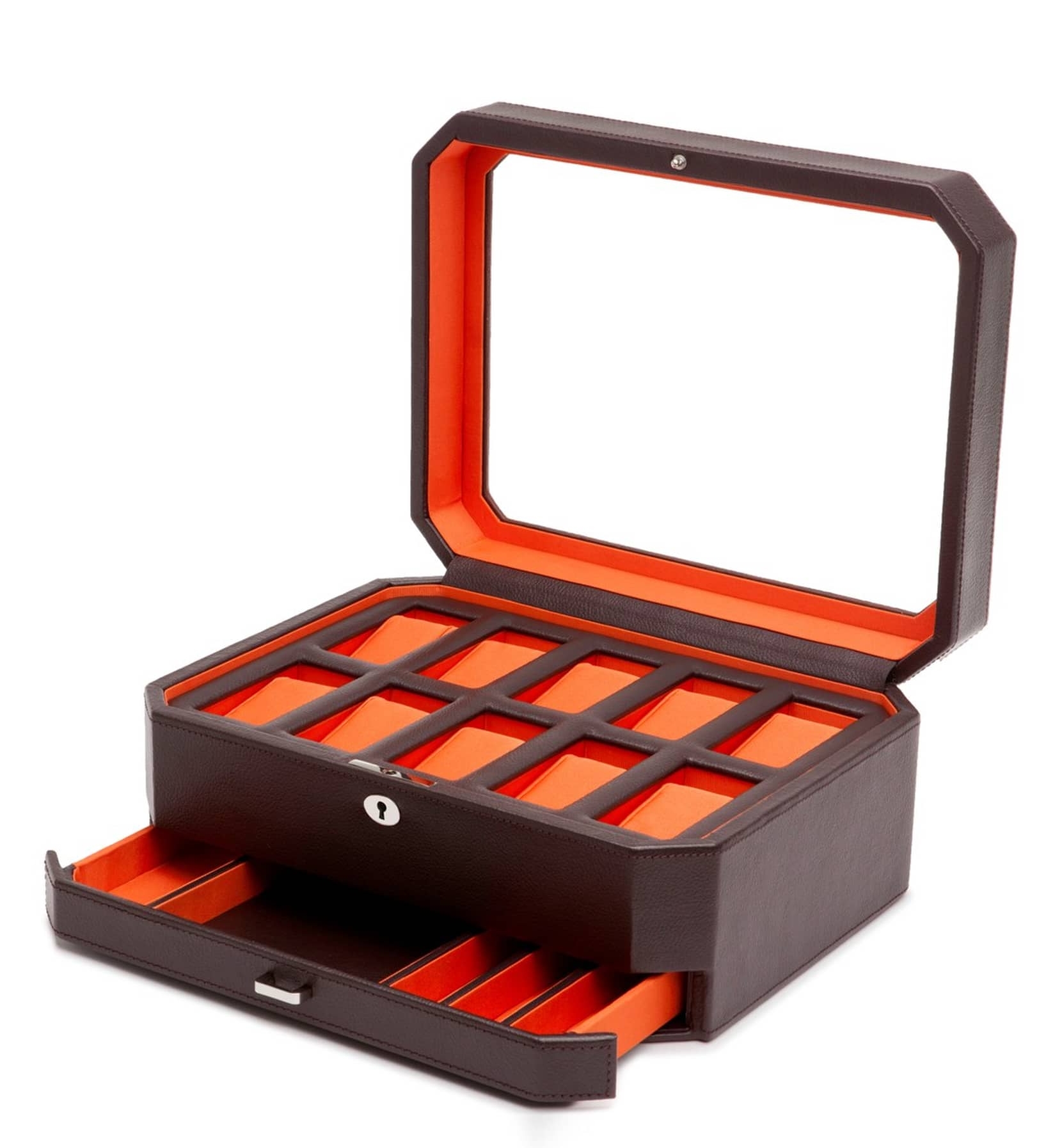 WOLF Windsor Watch & Accessory Case is a mid-century-designed case conceived to hold and preserve watches and other accessories with a soft silk lining for plush protection. WOLF Windsor Watch & Accessory Case offers 17 interior storage compartments, 8 ring rolls, and 10-piece watch storage.