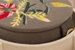 The compact vintage-inspired design opens at the sides, front and top to reveal many slots and compartments, a matching round box that can be used for traveling and a mirror to see how everything looks before setting out for the day.