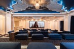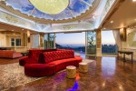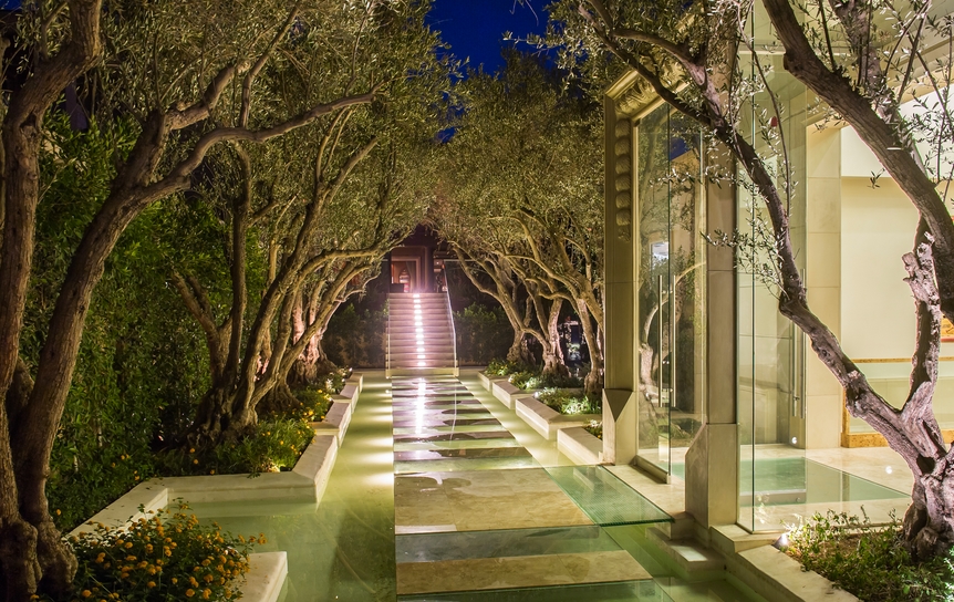 This Beverly Hills residential compound is owned by successful, self-made real estate entrepreneur Jeff Greene. The owner invested tens of millions to complete and expand Palazzo di Amore after purchasing it, finishing the second floor of the main residence and building a massive approximate 15,000 square foot entertainment center that includes a disco/ballroom with a revolving turn table style dance floor, DJ booth and a laser- light system. The entertainment complex features a 50-seat private screening room, a bowling alley and a game room. It can host up to 250 guests for a seated dinner or event. Guests are welcomed to the two-level structure through a floating glass-floor walkway over pools lined by 70 year old mature olive trees. The interior features limestone floors with marble and maple inlay, hand-painted ceilings, and paneling of maple burl wood.