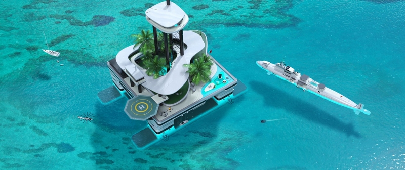 Migallo is also building a private floating island based on semi-submersible platforms. The island is called Kokomo (Length over all (LOA): 117 M). Of course, the island is customizable in size, shape and features.