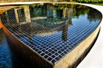 The violin pool is further inundated with cutting edge technological advances. The violin “strings” are embedded within the gradient glass tile blend on the pool floor, and have 5760 strands of fiber optics woven seamlessly through the glass tile that are subsequently wired to 40 illuminators. “Every aspect of this pool was challenging,” says Chris Cipriano, President of Cipriano Landscape Design. “Weaving the fiber optic strands into the glass tile pattern was extremely technical and had not been attempted previously in the pool industry.”