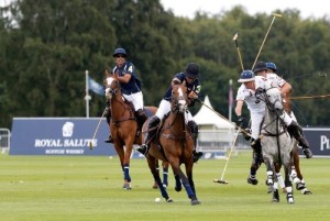 South America (navy) and England fight for the ball during The Royal Salute Coronation Cup at Guards Polo Club in Windsor Great Park on July 25, 2015 in Egham, England. (Photo by John Phillips/Getty Images for Royal Salute) (PRNewsFoto/Royal Salute)