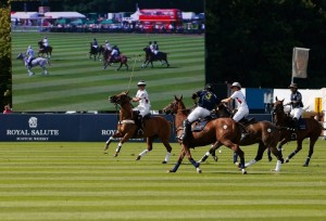 South America (navy) and England fight for the ball during The Royal Salute Coronation Cup at Guards Polo Club in Windsor Great Park-