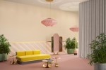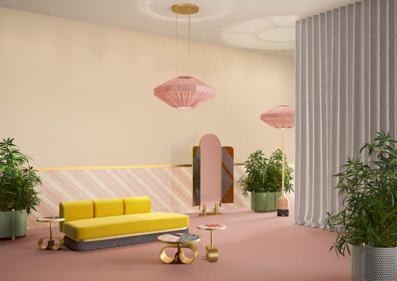 With a soft and rarefied tone, distinguished by simple volumes and rounded shapes, THE HAPPY ROOM by Celestino suggests harmony and delicacy. Numerous are the references to iconic elements of FENDI, such as the distinctive arch of Palazzo della Civiltà Italiana in Rome, or the inlay of materials; drawing on the stylistic matrix of the FENDI fur atelier and of fur workmanship, which is repeated within the collection through innovative techniques and the contrasting play of various types of