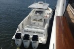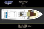 Deep Impact 399 open fisherman comes equipped with large T-top, side door, air conditioning in head compartment, towing eye for towing boat behind the yacht. The Deep Impact has been custom painted to color coordinate with the yachts’ motif.