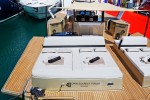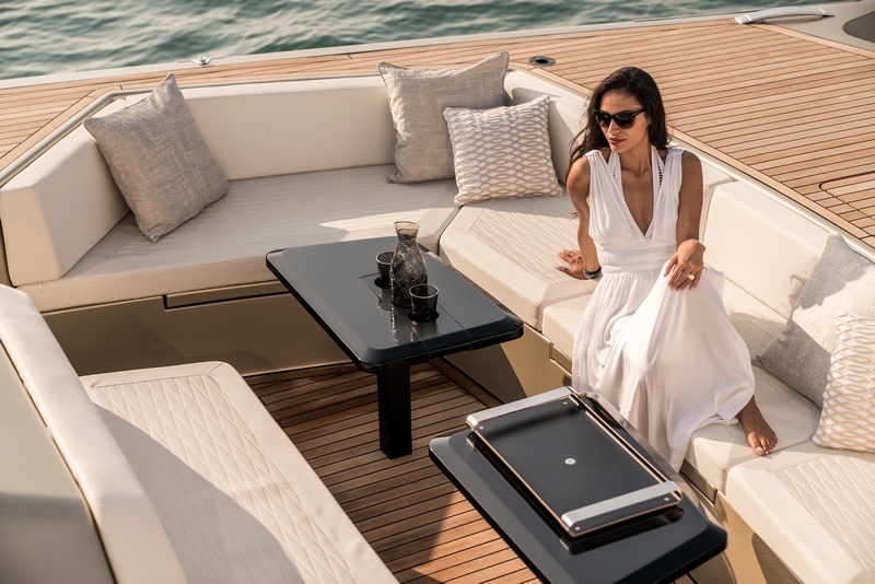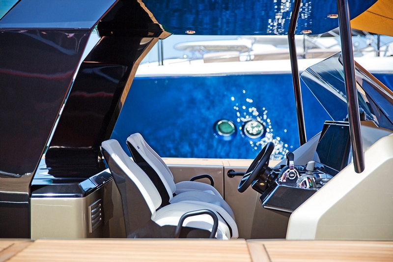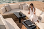 The volume below the aft sunpads conceals immense storage to keep water toys and diving gear at hand. The helm, fitted with echelon seats is well protected and equipped with a touchscreen to easily scroll through the boat’s systems.