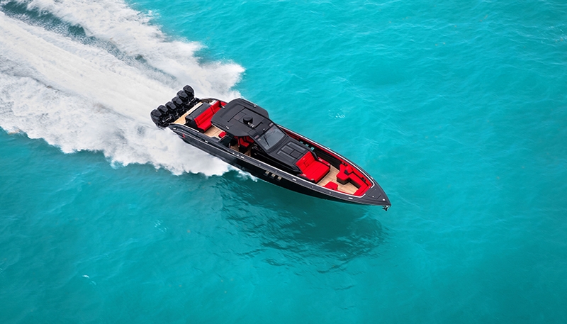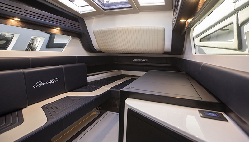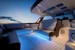 Skillfully engineered to provide a low center of gravity for increased performance and comfort without compromising a beautiful design aesthetic, the Cigarette signature four-pillar, all carbon-fiber hardtop features an 8′ wide, double-curvature, frameless tempered safety glass windscreen offering exceptional wind protection. Integrated flood lights, boarding handrails, full-spectrum ambient lighting, skylights, windshield wiper with cleaning system and electrically actuated sun shade prove that the demands of occupant comfort can be bridged with beautiful design.