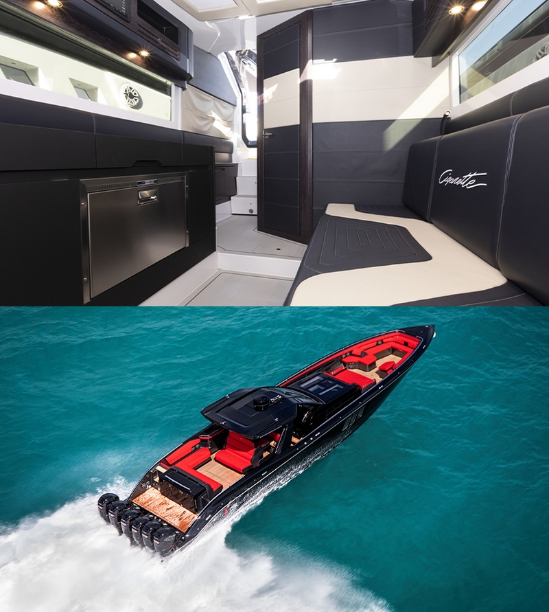 The know-how, the innate elegance and the passion for new challenges, led Italian luxury furniture maker Poltrona Frau to array the interiors of the powerful Tirranna 59’ boat by Cigarette Racing.