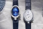 Both watch models feature this ingenious hand set the tone. The first model, a 20-piece limited edition, elegantly combines a white gold case with a midnight blue mother-of-pearl dial, whose subtle hues vary as the light plays over it. The second timepiece, also in white gold, makes it out with a white lacquered dial, contrasting with its midnight blue alligator strap.