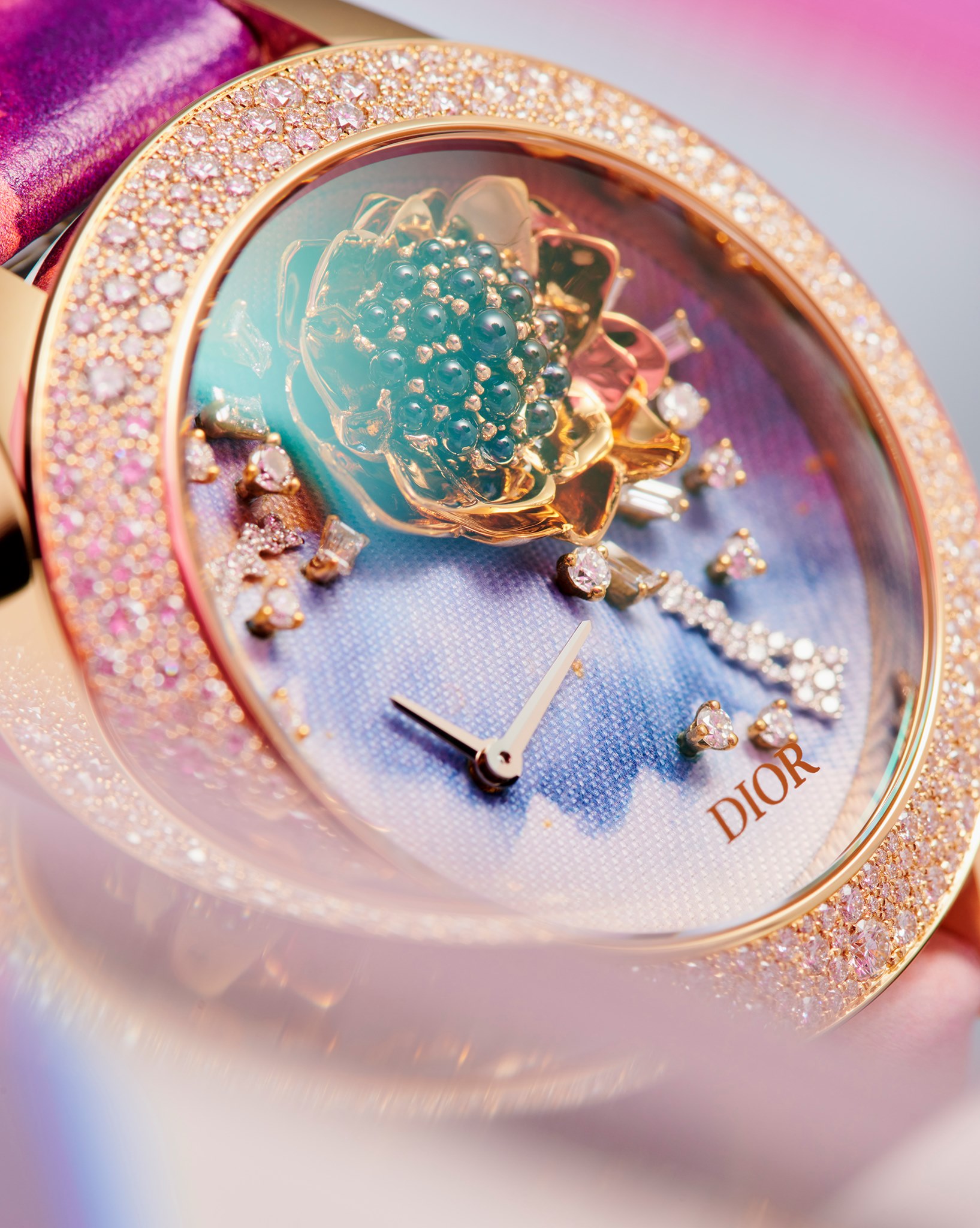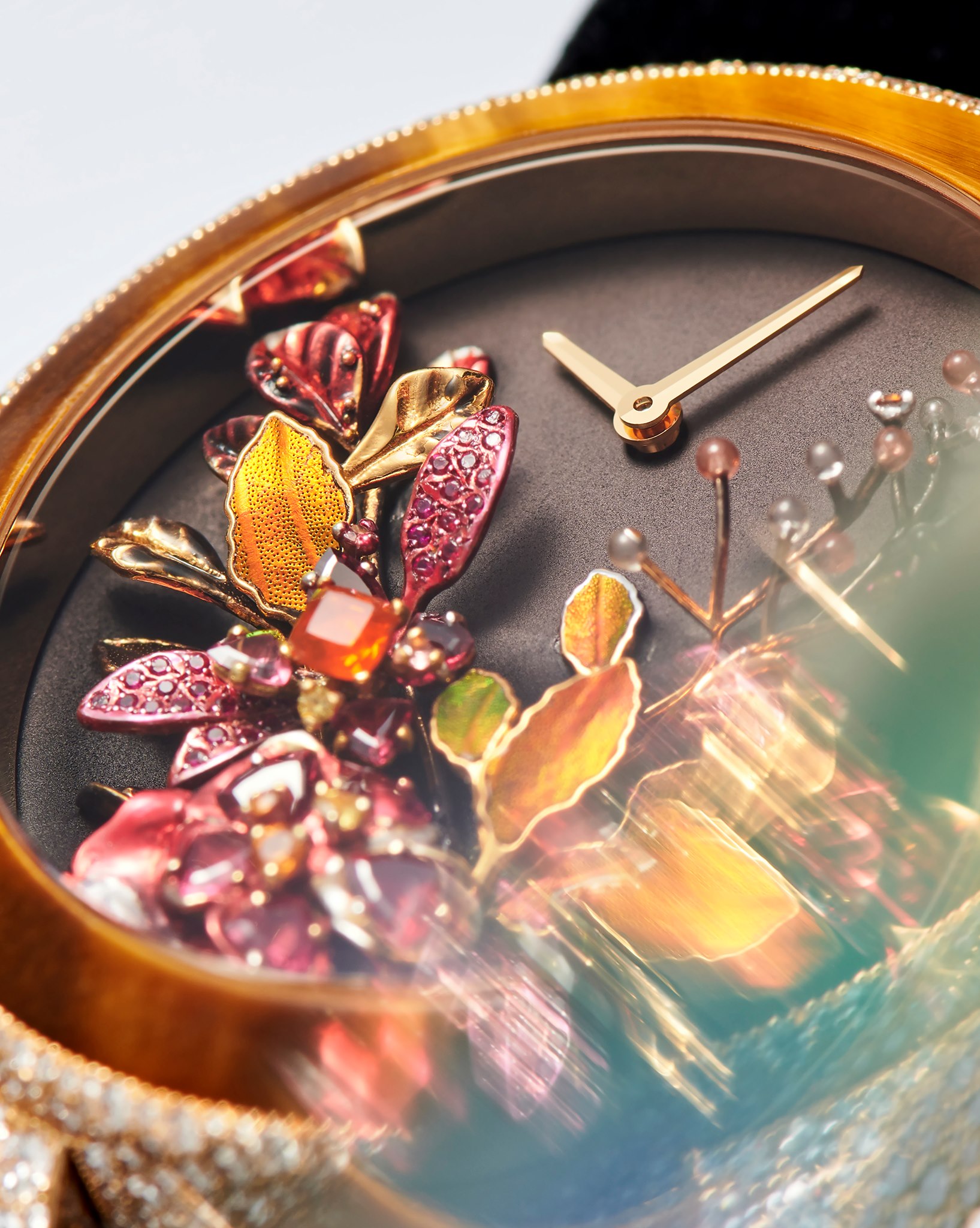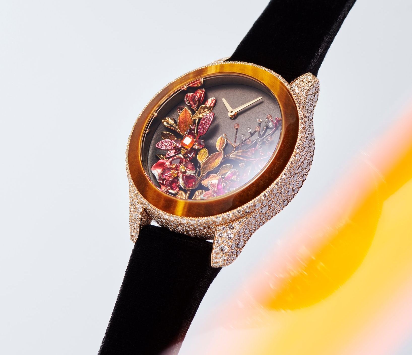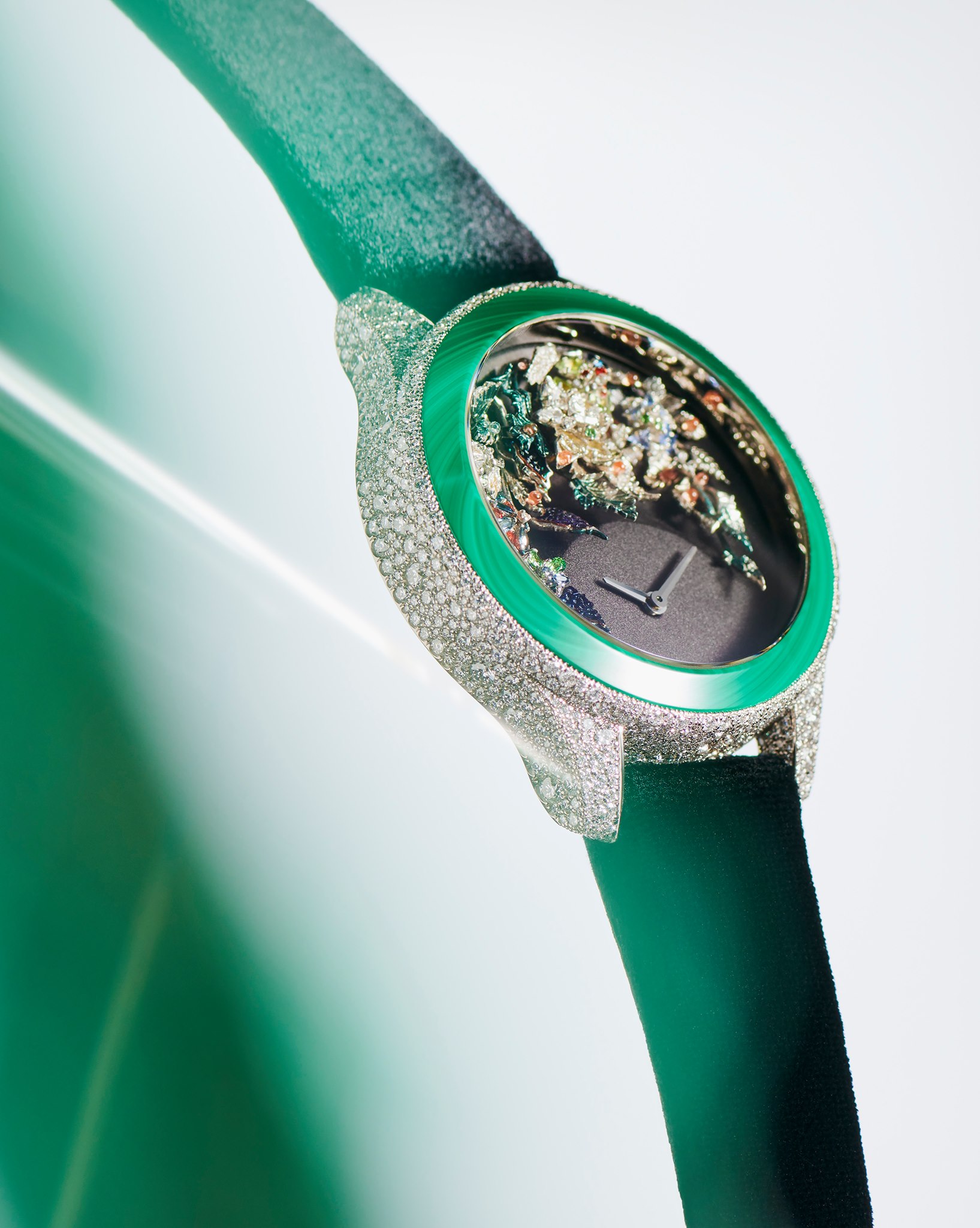 With a quartz movement, each unique Dior watch represents a different garden bathed in the dream-filled twinkling light from dusk to dawn, evoked through leaves and petals in precious stones and scarab marquetry, framed by a hardstone bezel on a snow-set diamond case.