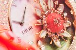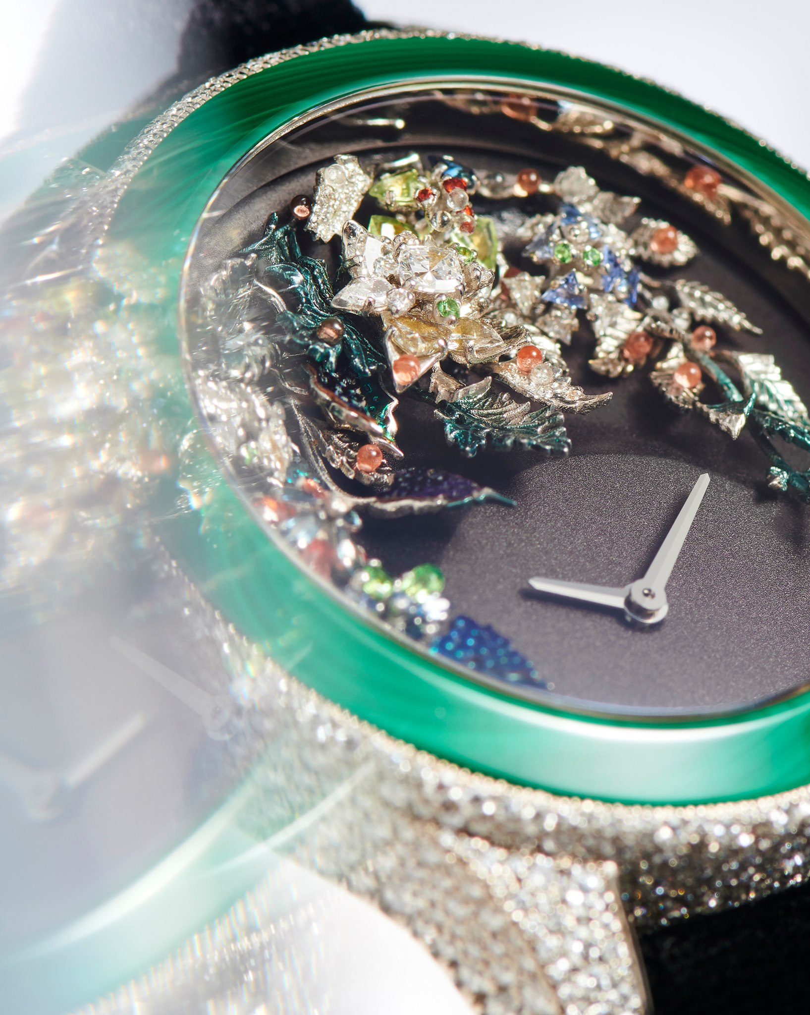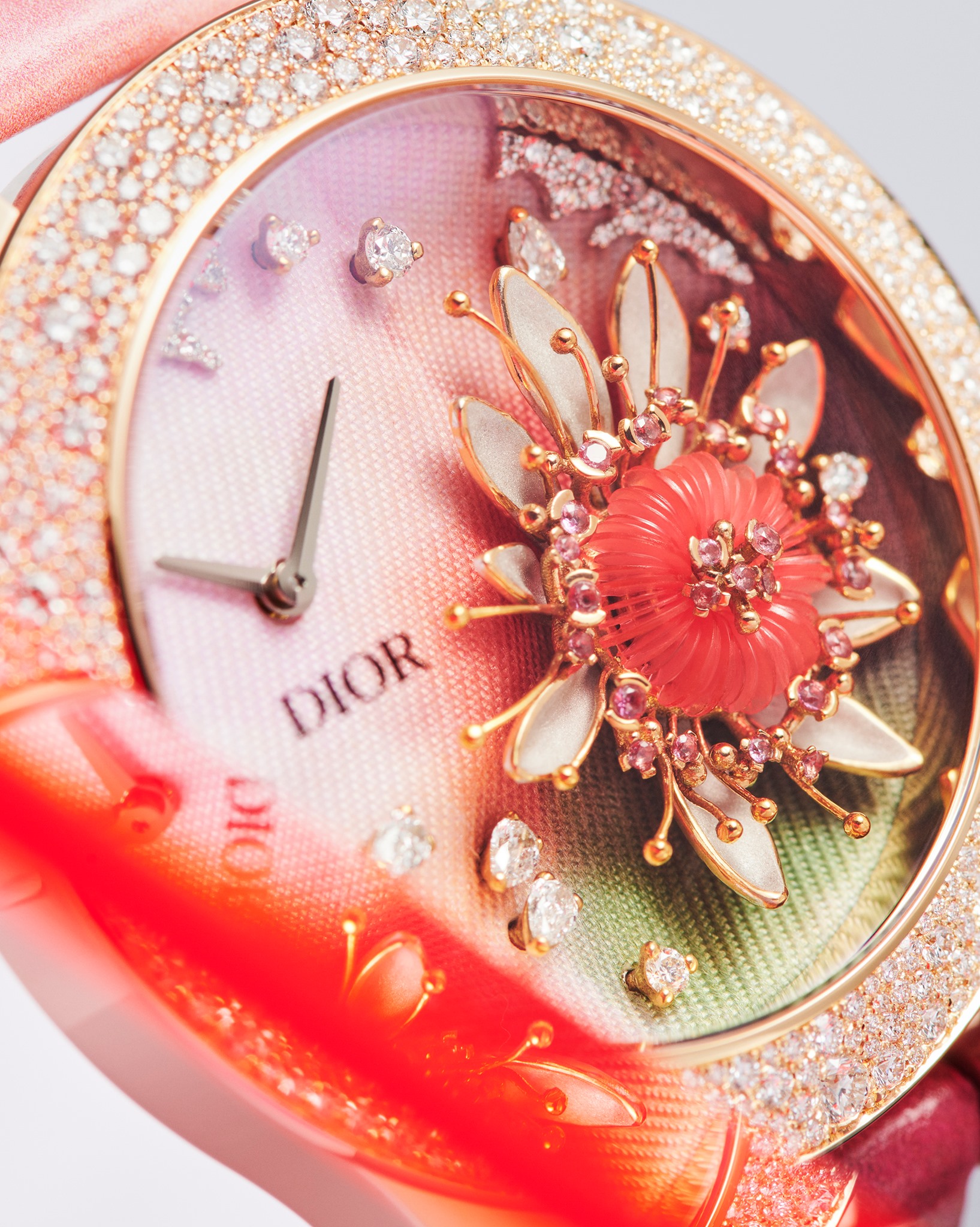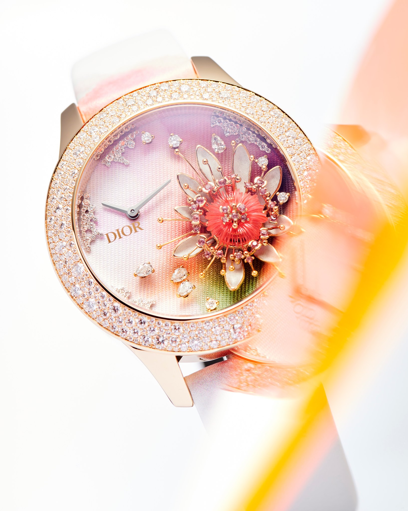 With a quartz movement, each unique Dior watch represents a different garden bathed in the dream-filled twinkling light from dusk to dawn, evoked through leaves and petals in precious stones and scarab marquetry, framed by a hardstone bezel on a snow-set diamond case.