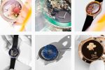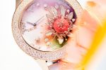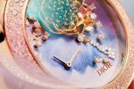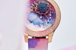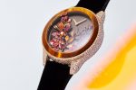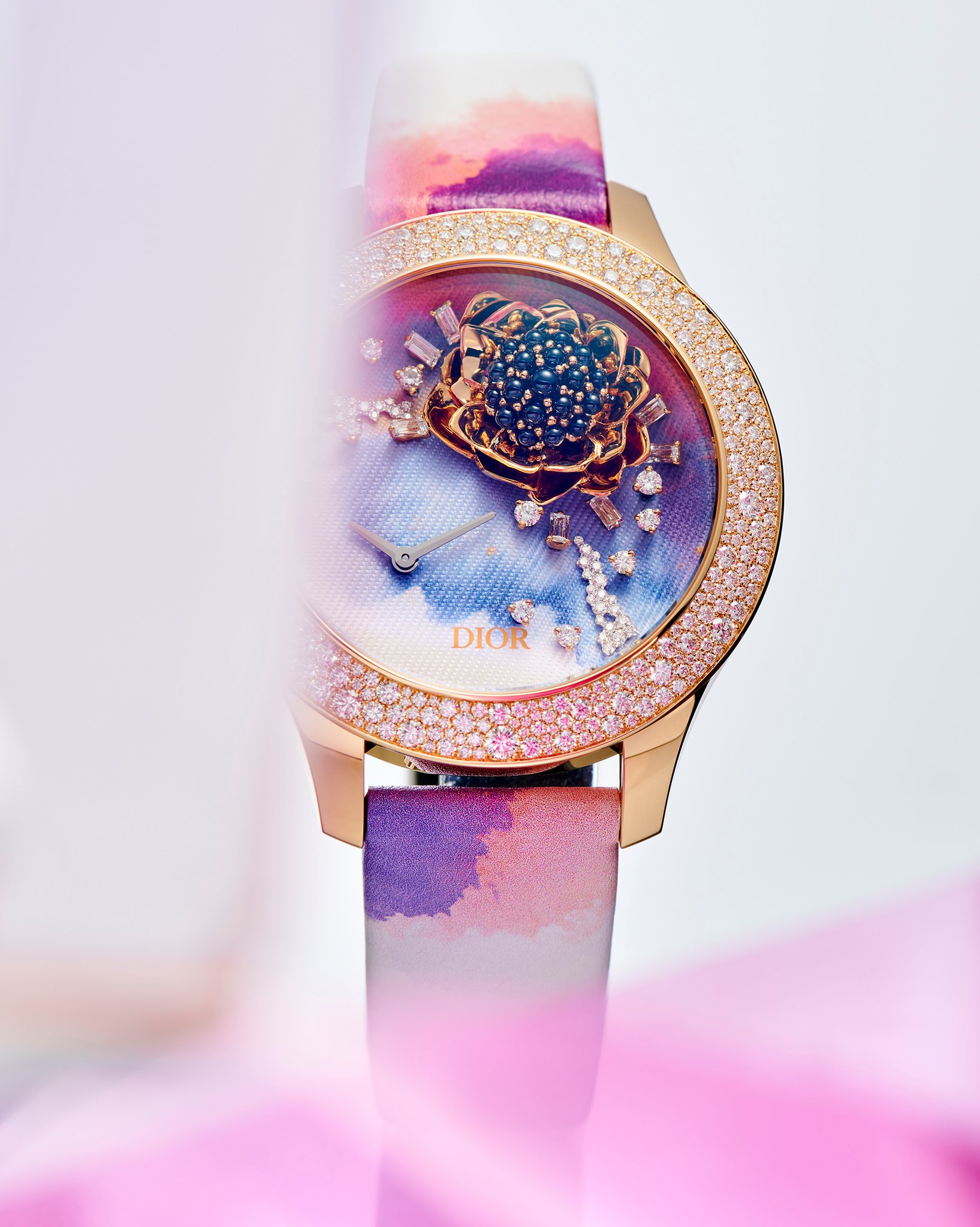 The two newly introduced, quartz-movement ‘Dior Grand Soir Aquarelle’ watches are evoking the delicate hues of watercolor. These rose gold cases with snow-set diamond bezels feature softly painted bracelets and dials, the latter like abstracted petals enhanced by the placement of gold flowers with sapphire and tinted glass touches. Each style comes in a limited edition of 18.