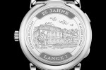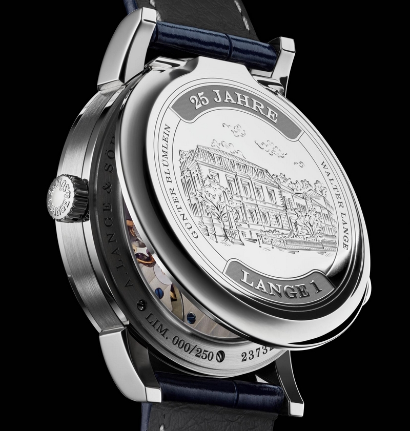 The A. Lange & Söhne LANGE 1 “25th Anniversary”, limited to 250 watches, has another prominent feature: the engraved hinged cuvette crafted from solid white gold. The engraving depicts the Lange headquarters that date back to 1873, the names of Walter Lange and Günter Blümlein, and a relief engraving of the inscription “25 YEARS LANGE 1”.