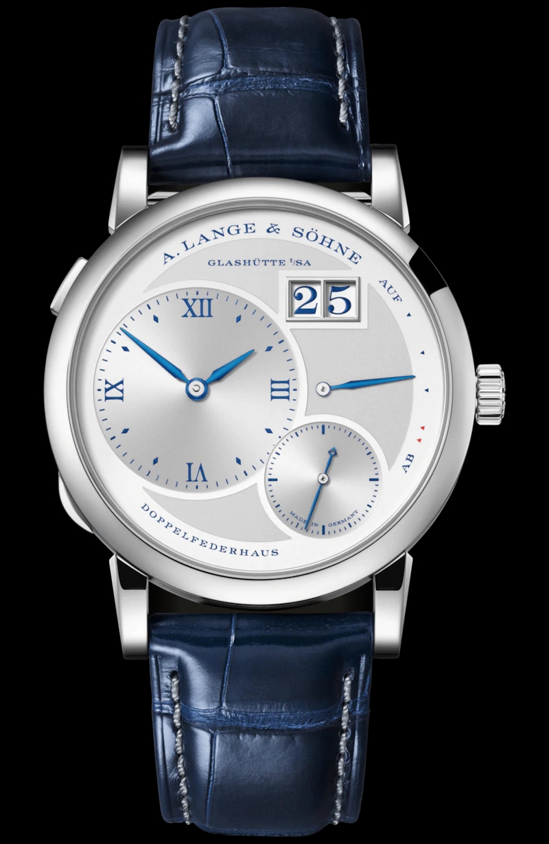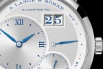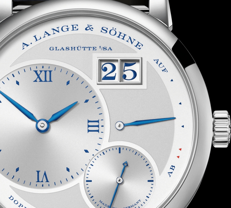 In 2019, A. Lange & Söhne manufacture is celebrating the LANGE 1 with a “25th Anniversary” edition in white gold. Its special features include an argenté dial with deep-blue printed numerals, blue date numerals, blued steel hands, and a hand-engraved balance cock with blued lines.