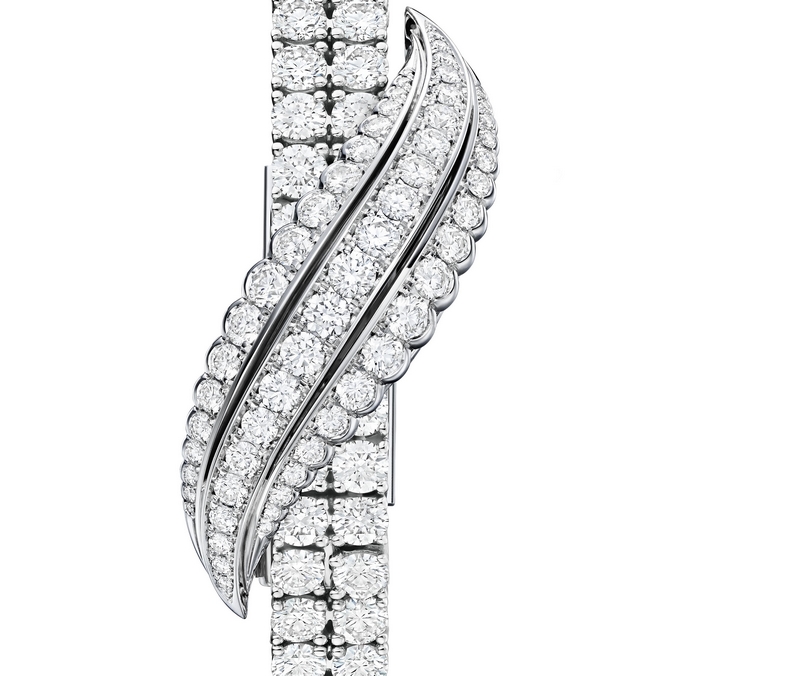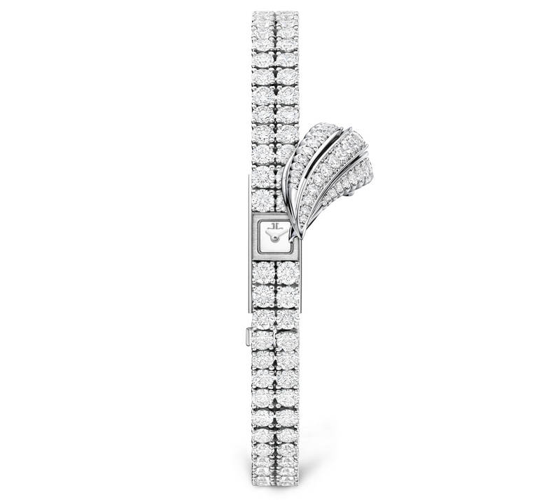 Closely reproducing the curved and sensual lines of a leaf, the headdress of this secret watch can be raised or lowered with one simple movement. Whenever its owner desires, the 101 Feuille secret watch in white gold unveils its silvered opaline dial with absolute discretion.