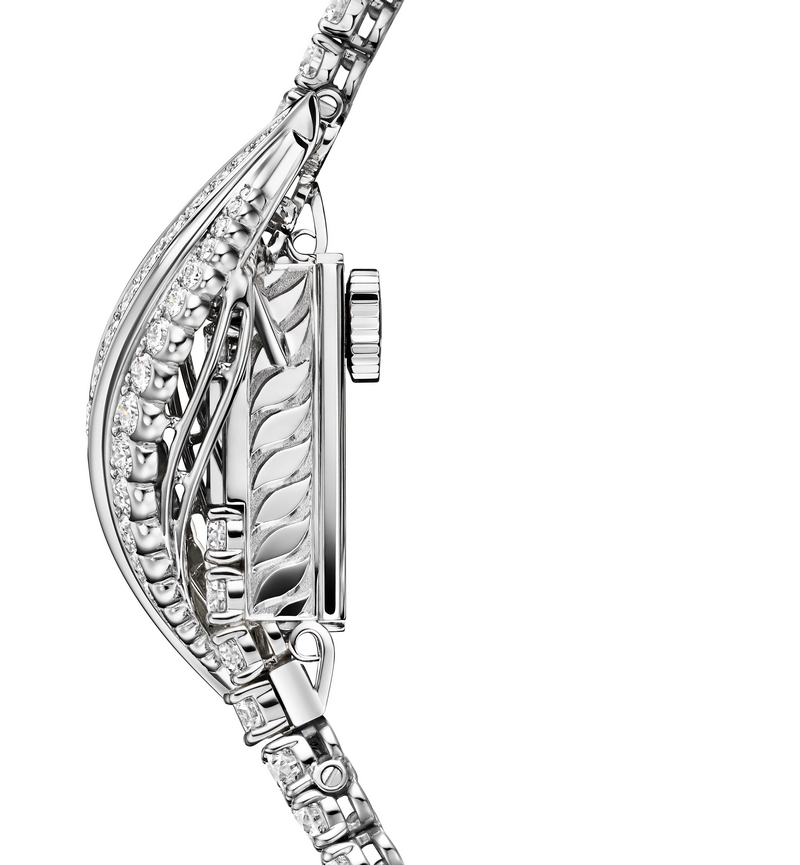 Under the dome of the elegant and refined leaf, which gives it part of its name, this new jewellery-watch conceals the renowned Jaeger-LeCoultre Calibre 101. Developed by the Manufacture in 1929, it remains the smallest mechanical movement in the world to this day. An exception in terms of miniaturisation: 98 components manufactured and assembled at the Manufacture with a volume of 0.2 cm3, thickness of 3.4 mm and weighing barely a gramme.