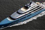 The 98.4m yacht project, with its generous 17.24m beam, was developed in cooperation with Toby Silverton and Reymond Langton Design. Taking cues from automotive design, the striking blue hull and taut, chamfered elements of the superstructure in metallic silver create a strong contrast of light and shade and emphasise the proportions.