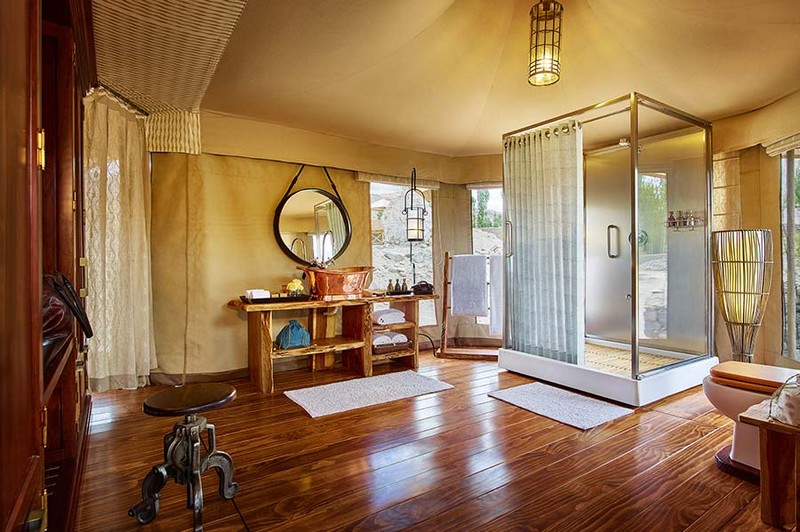 At 3,500 metres up, TUTC’s services cater to all the whims and fancies of its esteemed guests. This glamping project offers beautiful tents furnished with wooden chandeliers, four poster beds, exquisite linen to wooden period furniture. Each tent offers en-suite bathrooms with hot showers, in-house signature wash amenities, safe deposit, laundry service, private decks, unlimited Wi-Fi at the reception tent, 24/7 security & paramedic on site, 24/7 electricity, boutique, library and services of a personal butler.
