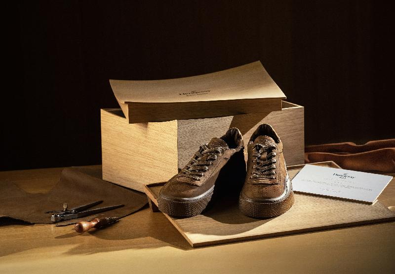 True to the sneakerhead aesthetic, Kim Jones made packaging a part of the overall experience. Each pair of HNY Low by Kim Jones comes sheathed in cotton dust bags bound by a high-end drawstring, a shape recalling bottles that used to be wrapped in thick paper during travel. The sneakers are presented in an oak box that revisits the barrels used to age the eaux-de-vie, its wavy top echoing the plateau for the Hennessy X.O Masterpiece designed by Kim Jones.