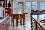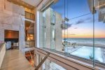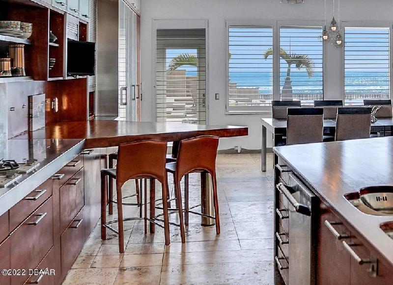 The entertainment-style kitchen features an 18-foot Borneo rosewood counter. It is designed for large parties and family dinners. It has room for a billiard table to enjoy a game or two and views of the beach and the 63-foot three-lane infinity pool. The pool is framed by water cascades, palm trees and private access to the beach.