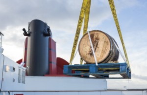 A 300 litre Jack Daniel's barrel being hoisted by crane onto Queen Mary 2 in Southampton, England on Sunday, Jan. 10, 2016. (PRNewsFoto/Cunard)