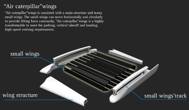 Discover the world’s most prestigious gatherings & exhibitionsAir-Elf Aircraft Concept designed by Yinze Hu has “Air Caterpillar” – a new type of wings which combine the advantages of both the jet aircraft and helicopter and can be transformed in order to meet the needs of flexibility and speed of the aircraft. Highly transformable, the vehicle can meet the vertical takeoff, landing, parking and high-speed cruising requirements. Air Elf was born after extensive research in aerodynamics, material, energy and aircraft design. The project won the entry prize of Lotus Prize 2010 and will solve the future congestion road problems.