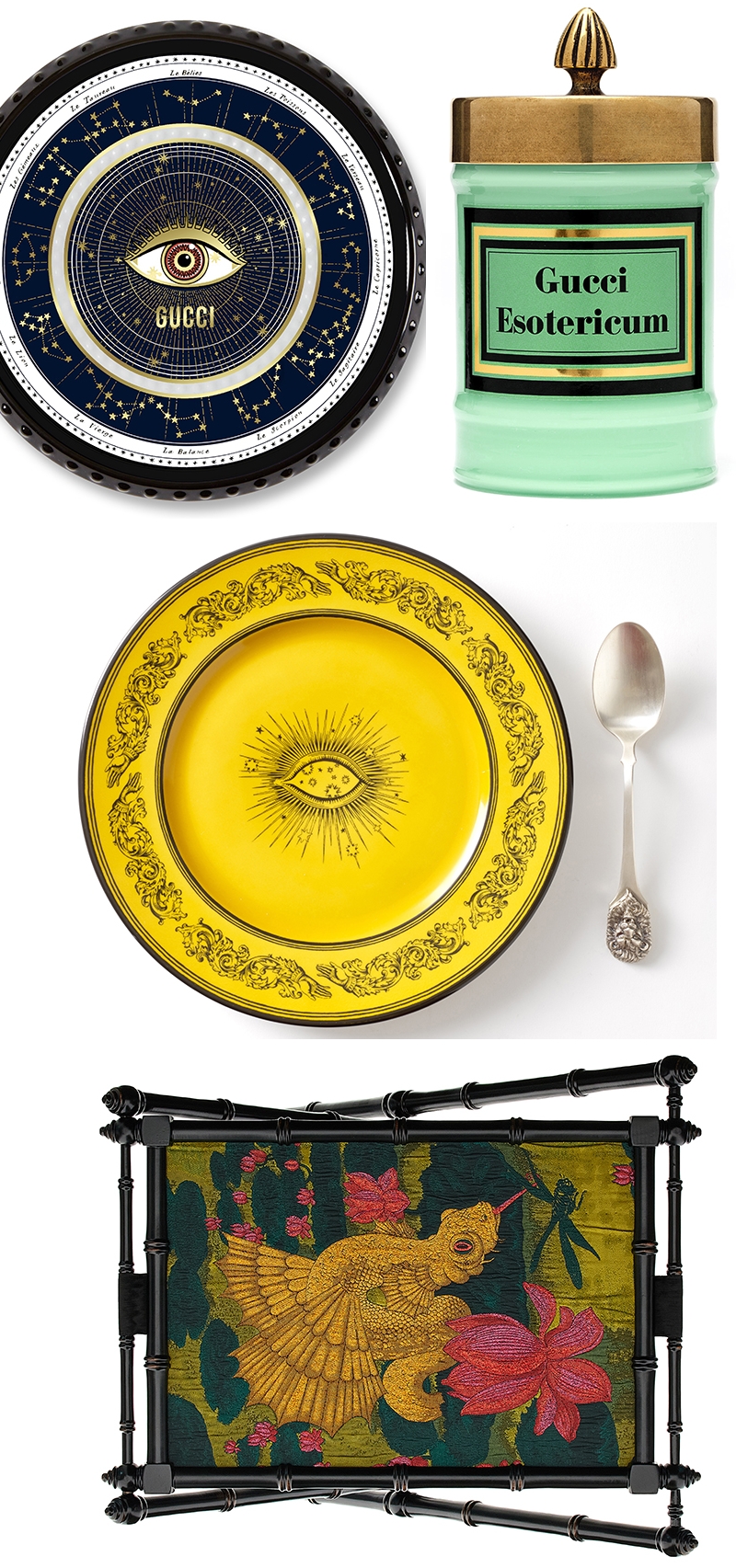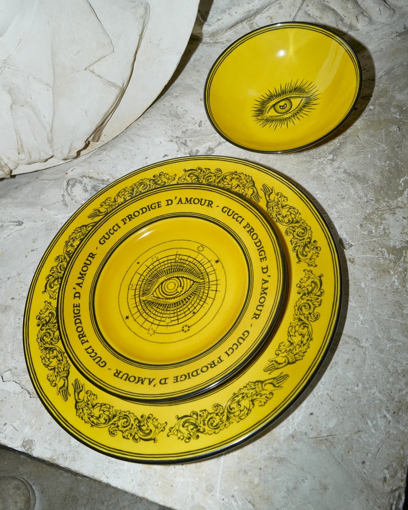 elements from the Creative Director’s designs are presented again for the Ouverture collection and create a link to Gucci’s rich history. The charger plate is defined by the eye, a recurring motif throughout Gucci’s collections, surrounded by starts and a ring of hands—a nod to the romance that inspires the luxury Italian house.
