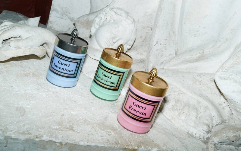 New from this 2021 powerful, romantic collection is a group of three candles in coloured opaline glass are reminiscent of the types of containers found in late 19th-century apothecaries. The scents are Esotericum, with notes of bitter orange, jasmine and leather; Inventum, a rose blend; Freesia, featuring violet, resin and African freesia.