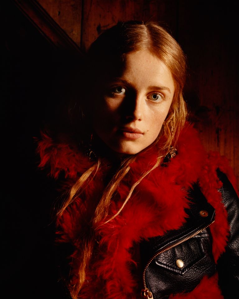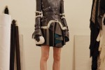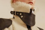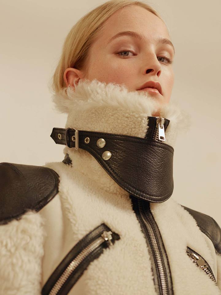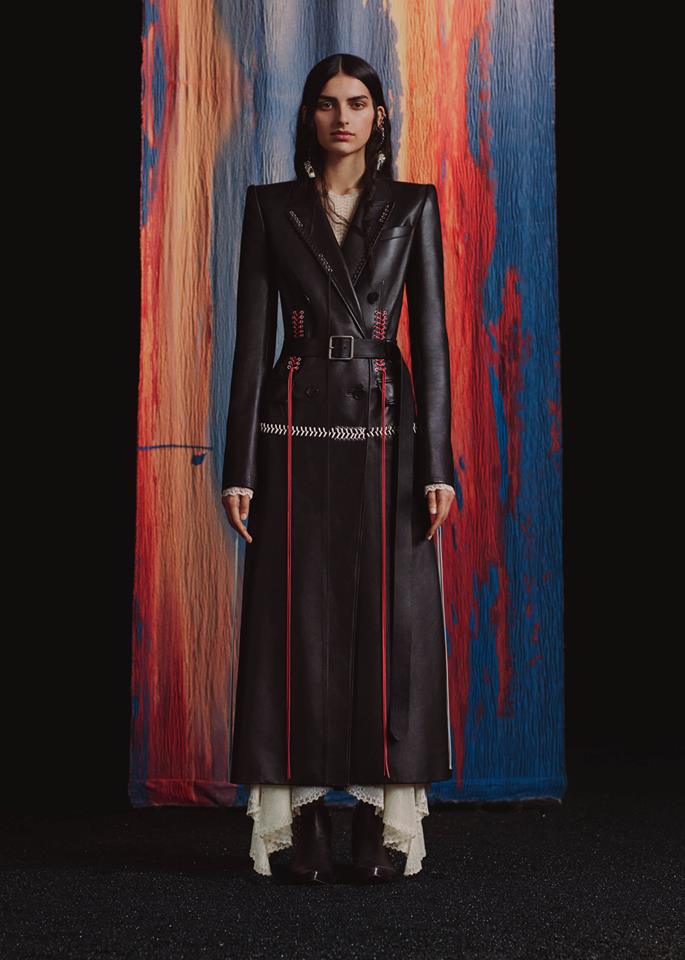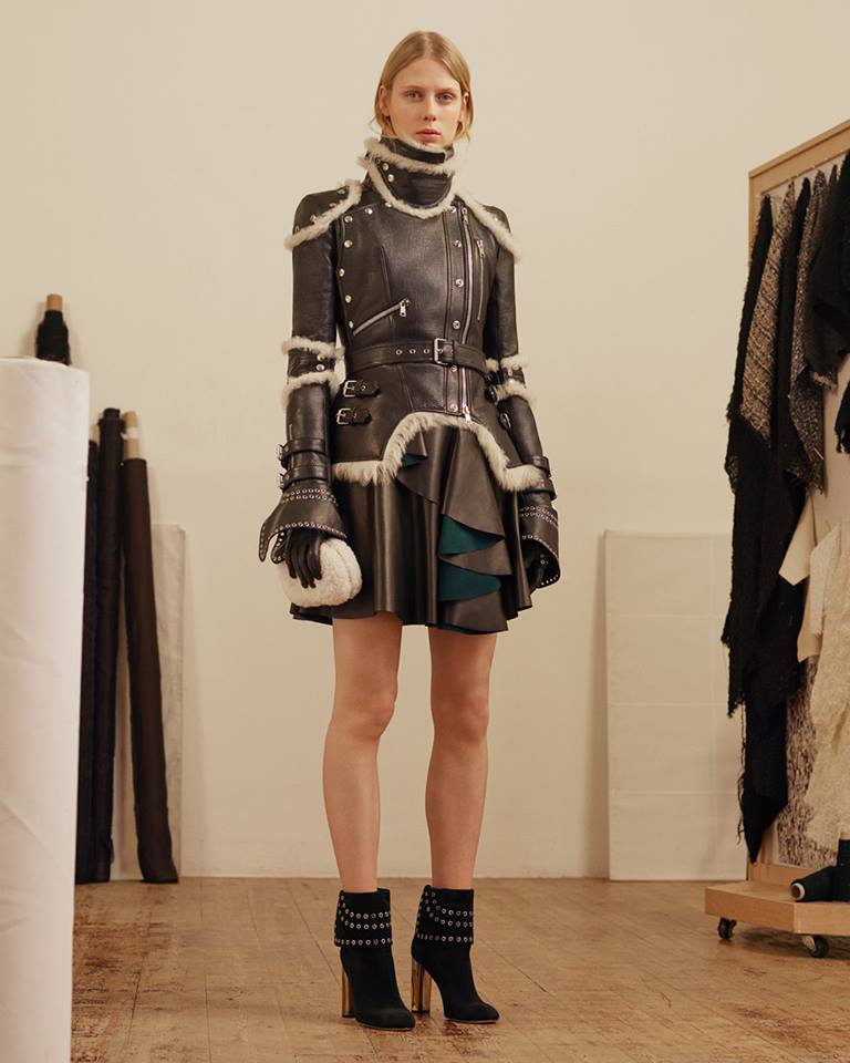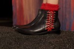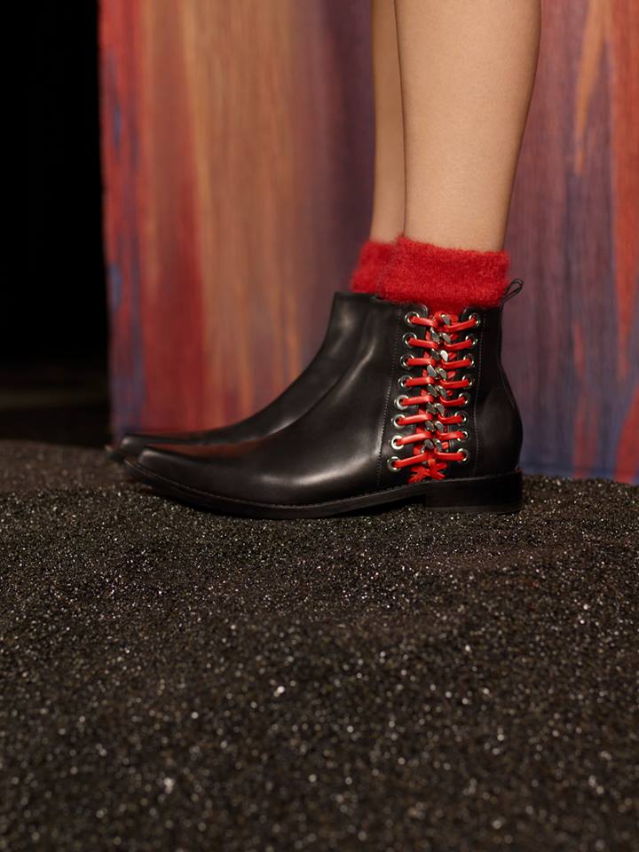 Braided chain ankle boots with leather lacing and hand-applied eyelets are worn with red mohair socks. Inspired by medieval armour, the Pre AW17 leather jacket was lined with shearling.