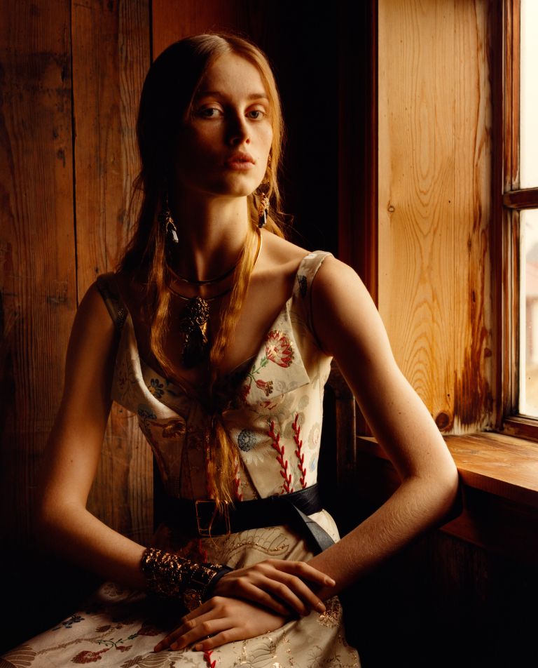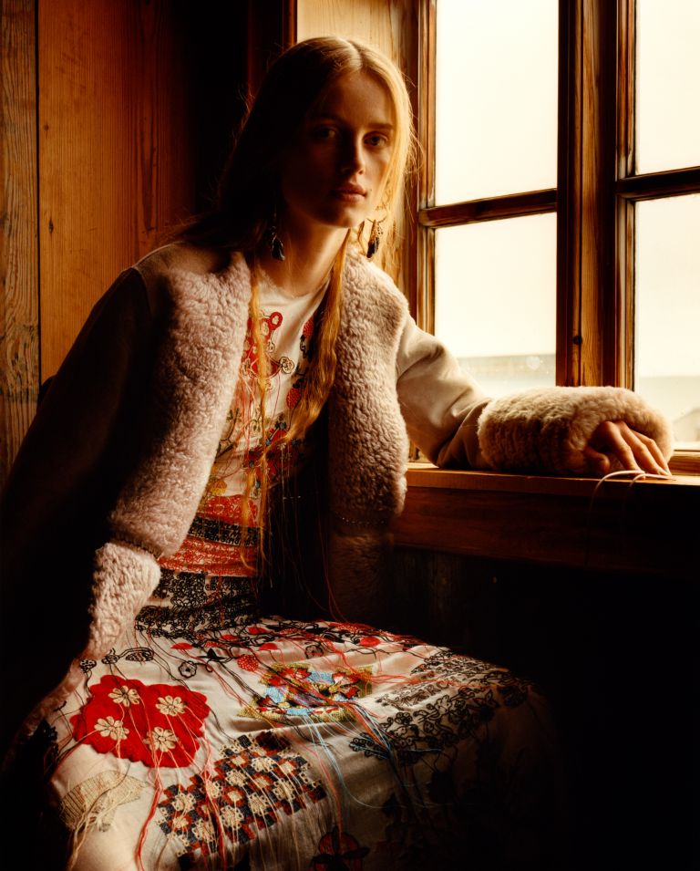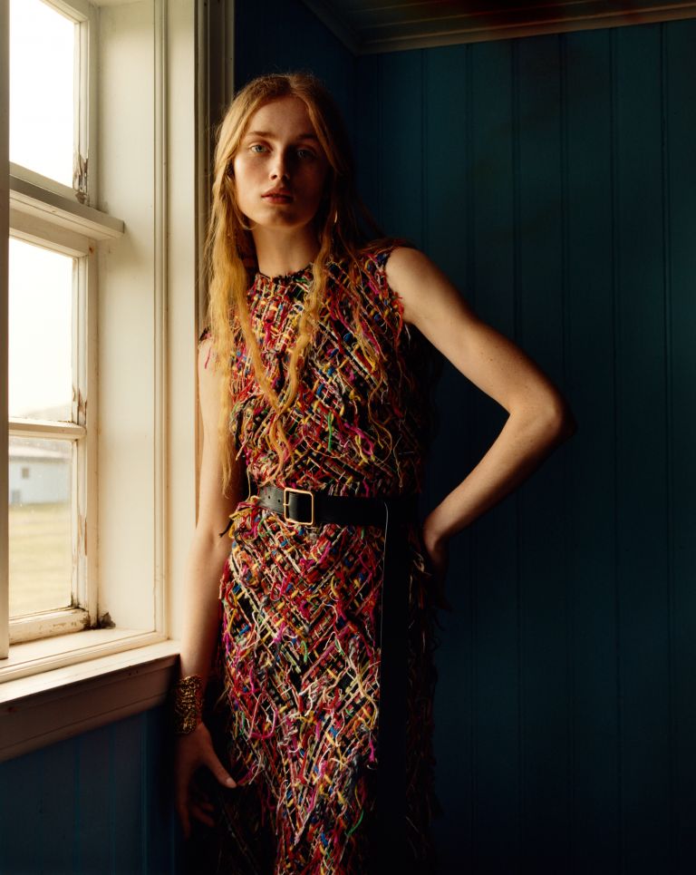 Working with Jamie Hawkesworth for a consecutive season, is photographed in the eternal light of the Icelandic landscape to create two contradictory sets of pictures. Juxtaposing the internal with the external, warm and vivid painterly interior portraits are set against a severe, unrecognisable landscape.