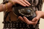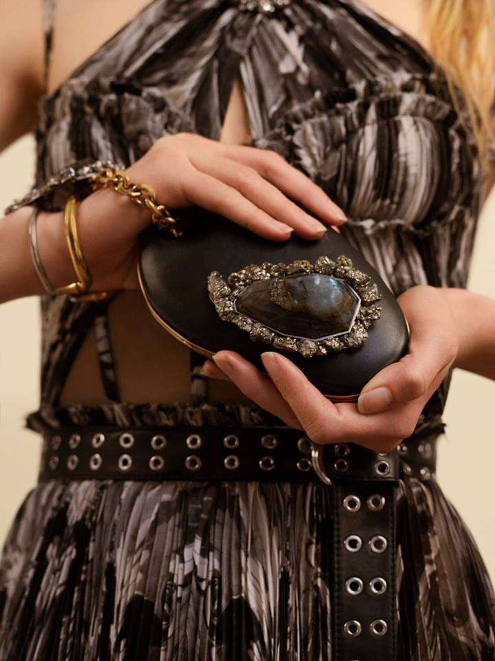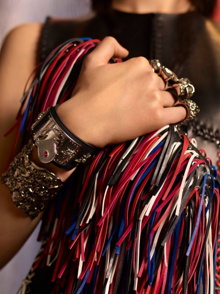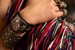 Inspired by the Cornish Cloutie tree, the iconic Four Ring Clutch is threaded with ribbons of leather fringing in scarlet, ivory, woad blue and fuchsia. The new Alexander McQueen bag is worn with a hand-forged metal cuff and Masonic padlock leather bracelet with Medieval engravings.