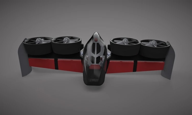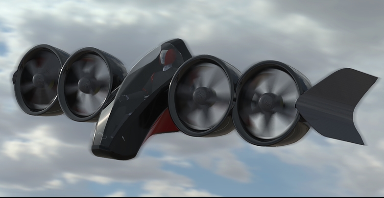 “The single-seat machine is a 4-rotor manned multicopter design, in which all four of its ducted rotors are inline along a single wing. Oriented vertically for takeoff and landing, they pivot horizontally for the actual flight. And so that the pilot does not undergo configuration changes, the cabin is connected by a gimbal system that allows him to keep his sitting position independently of that of the wing,” wrote inceptivemind.com.