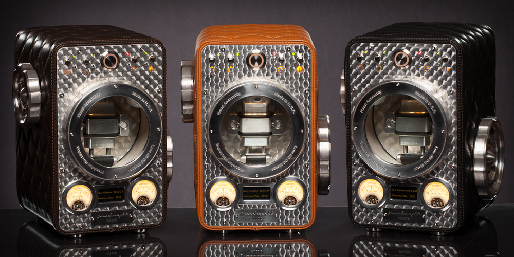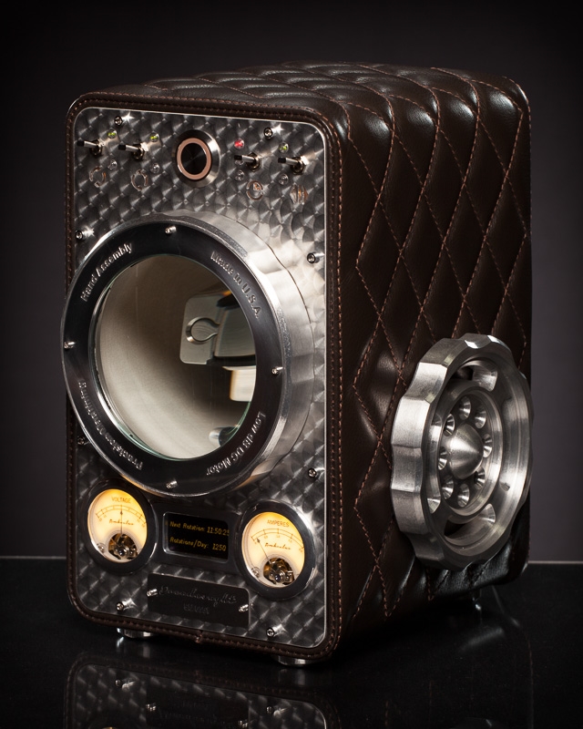 Designed, manufactured and assembled by hand in America, Ambrelus watch winder employs elements not normally associated with the category. Ambrelus features engine-turned finishes mirroring the guilloche patterns found in many high-end mechanical watches, analogue voltage and current meters that harken back to vintage stereo equipment of the 60s and 70s., and diamond quilted surfaces made from the finest Italian leathers.