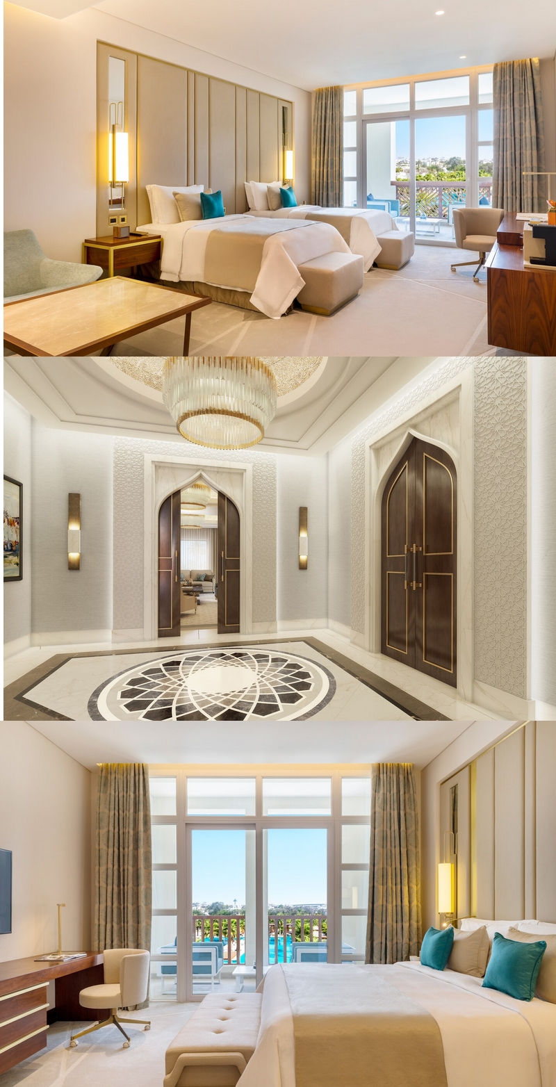 Guests arriving through the stately porte-cochere will be transported to their own private palace. Understated opulence hints at its 21st-century roots, where the three-story, light-filled lobby adjoins a lounge offering expansive views of the resort. Sculpted marble sits alongside mashrabiya, detailing original Arabic patterning with the contrast producing a warm and welcoming ambience, perfectly infusing modern design with Qatari accents.