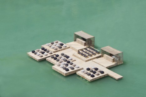 The thought of watching films here seemed surprising, according to arhchitect Ole Scheeren: “A screen, nestled somewhere between the rocks. And the audience… floating. Hovering above the sea, somewhere in the middle of this incredible space of the lagoon, focused on the moving images across the water. A landscape of pieces playfully joined together. A sense of temporality, randomness. Almost like drift wood. Or maybe something more architectural. Modular pieces, loosely assembled, like a group of little islands. A congregation of rafts as an auditorium.”
