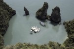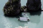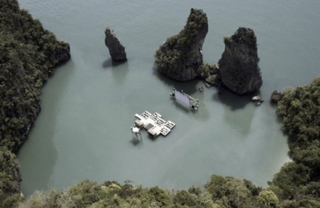 Beijing-based architect Ole Scheeren constructed an outdoor temporary floating cinema designed to be the stage for the final night of the “Film on the Rocks Yao Noi” new film festival in Thailand (9th- 12th March 2012). The floating auditorium was built in the most unlikely of places: in a lagoon with calm waters surrounded by towering island rocks. Two smaller rocks stood like teeth out of the water, forming a porous enclosure, inscribing an almost circular space.