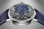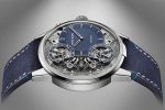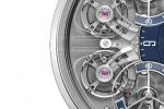 On the dial side, the two balance bridges have been openworked for more visual harmony between the two synchronized balanced wheels and the off-centre dial. The pusher at 2 o’clock allows the two running seconds indicators – which rotate in mirrored clockwise and counter-clockwise motions – to be reset to zero and visually track the state of resonance. The case back view reveals the engraved main plate, which details the specific characteristics of the Mirrored Force Resonance in bas-relief text. The remarkable symmetry of the movement is accentuated with its mirrored arrangement of open bridges and gears.