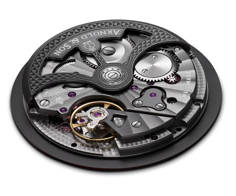 Entirely developed and manufactured by Arnold & Son, the Globetrotter’s A&S6022 features an automatic winding system by means of a central, rotor, engraved with a hobnail motif with a black ADLC treatment. When fully wound, the movement provides a power reserve of 45 hours.