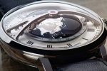 Seemingly floating above a silvery-white opaline dial with Roman numerals for the hour hand and a circular brushed chapter ring for the minutes, the world-time display is surrounded by a 24-hour sapphire disk fixed to the same bridge that hold the hemisphere, transparent between 06:00 and 18:00 and with a translucent metallic treatment from 18:00 to 06:00, serving as a day and night indicator.