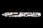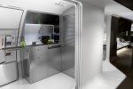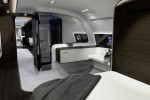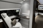 When entering the cabin, the air passenger is met by a wide, open welcome zone, which also encompasses a galley, a kitchen, a private room and a bathroom. Behind the lounge and dining areas, the cabin is divided up into a separate room with entertainment and information technology, and the guests’ private area. The bathroom and bedroom feature an open-plan design around a free-standing shower with transparent walls. A special highlight is the large, luxurious bed with its concave, upholstered headboard.