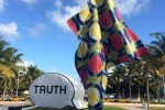 Speaking of beaches, there’s one right down the road from the fair, particularly inviting after a day under Art Basel’s meat-locker-like air conditioning. There’s also a public sculpture park, no ticket required, and this year’s presentation has three especially attention-grabbing works. Sterling Ruby’s massive yellow seat is poised between a throne and an electric chair: the most sinister of selfie backdrops. The chainsaw-wielding Ursula von Rydingsvard has devised a bronze sculpture that dematerializes as it rises, from solid blocks into a gauzy mesh. The Thai artist Rirkrit Tiravanija has commandeered an electronic road sign, the sort you see at construction sites, and rigged it to broadcast gnomic statements to the traffic on Collins Avenue. TOMORROW IS THE QUESTION, it reads. Or FREE CURRY, or WHICH WAY TO HAPPY, or indeed RICH BASTARDS BEWARE. In Miami, we all get the irony of that last one.