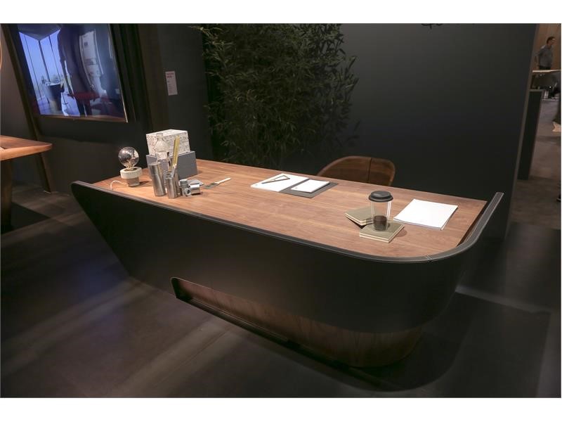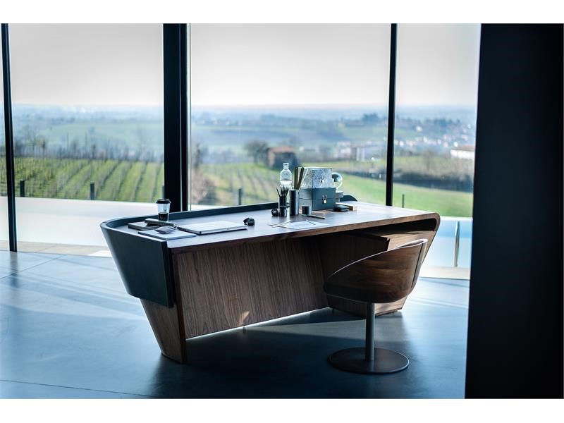 Each piece of furniture is characterized by sinuous and stylish shapes, appealing through its fine workmanship and the quality of natural and genuine materials, such as walnut solid wood and black leather.