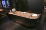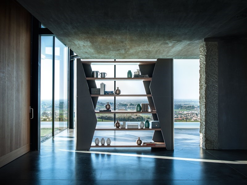 FINESSE – made of solid wood, it is characterized by asymmetrical supports in curved and shaped plywood covered with leather, in which are fitted six shelves made of solid walnut, 5cm thickness.
