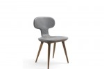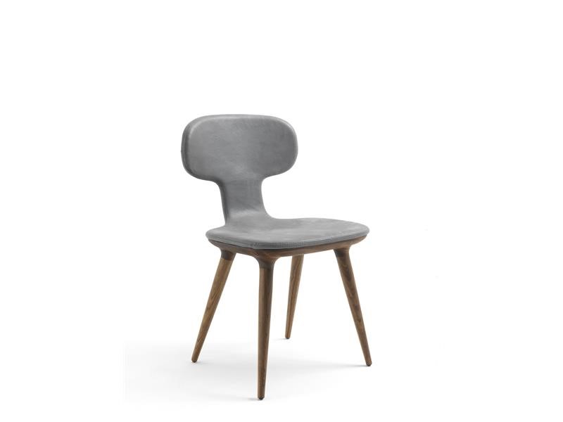 KLUTCH – upholstered chair, covered in leather with visible stitching and sinuous and enveloping forms, with a shaped structure made of solid wood.