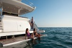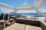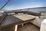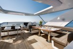 The swimming platform is incredibly large – almost 9 square metres – and provides plenty of space for the launch and retrieval of tenders exceeding 4 metres in length or of jet skis. Further forward, the space is divided into a large sun deck that can comfortably accommodate four people, and an area with a ‘C’-shaped sofa just aft of the windscreen, with further storage.
